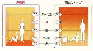 床面から天井までの温度がほぼ一定になるので、足元が寒く顔が火照るような不快感が起こりません。