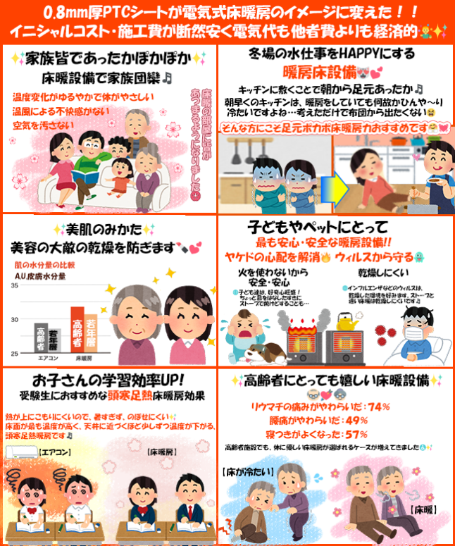1日8時間、6帖間に使っていたとした場合、なんと1日の電気代は約70円。 ちなみに、エアコンで同じ条件の場合は約300円。床暖のほうが実はすごくお得なんです。 しかも、メンテナンスは不要なので余計な手間や出費はナシ。 とてもコストパフォーマンスが良いのです。 |
